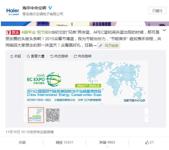 昨日,海爾中央空調(diào)官方微博首次向全社會(huì)發(fā)起“眾籌節(jié)博藍(lán)”行動(dòng)。該活動(dòng)以“我為藍(lán)天出份力”為主題,采用眾籌形式,旨在讓社會(huì)各界更多人參與到環(huán)境保護(hù)的公益事業(yè)中來?;顒?dòng)微博發(fā)出不到一天時(shí)間,就得到1萬多網(wǎng)友參與轉(zhuǎn)發(fā)。