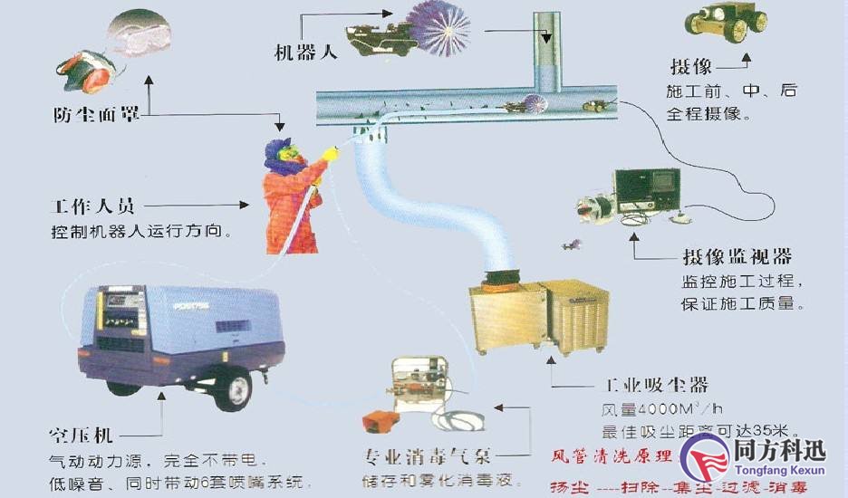 通風(fēng)管道系統(tǒng)的清洗是清洗工作中的關(guān)鍵難點(diǎn),因?yàn)橥L(fēng)管道一般在吊頂內(nèi),即使不在吊頂內(nèi)因?yàn)轱L(fēng)管都是密封連接的,也很難清洗,常采用機(jī)械清洗方法?,F(xiàn)在常見的清洗方式是從機(jī)組的帆布軟連接處將檢測(cè)機(jī)器人或氣動(dòng)機(jī)器人放置在通風(fēng)管道內(nèi),通過管道外的機(jī)器人操控箱控制通風(fēng)管道內(nèi)的清洗機(jī)器人,對(duì)于含塵量較多的管道系統(tǒng)還得用風(fēng)管集塵器徹底收集管道中的垃圾,以防止造成二次污染。
